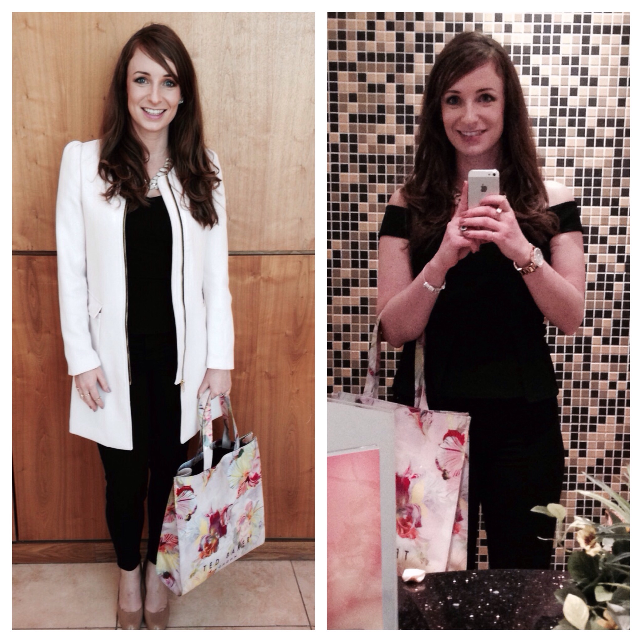 I wore Black Molly Jeans and Peplum top, both from River Island, Pink Coat and Chain from H&M, Floral Bag from Ted Baker and my much adored Nude shoes from LK Bennett.